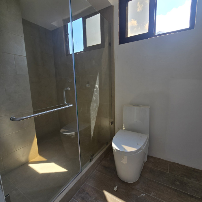 El apartamento cuenta con 3 Habitaciones, el dormitorio principal con área de walk-in closet, baño principal completo con su mampara de vidrio y espejo incluido, los dormitorios secundarios con closets , baño secundario, cocina con gabinetes, isla de comedor con conexión para lavavajillas, comedor amplio y sala principal con excelente iluminación, área de balcón, cielos falsos con cortineros ocultos, área de jardín con grama artificial, área de pérgola de madera, piso cerámico importado imitación madera y el gabinete de lavatrastos, área de lavandería con pila y calentador eléctrico de 40 galones, ventanería de aluminio anodizado y vidrios de color bronce.