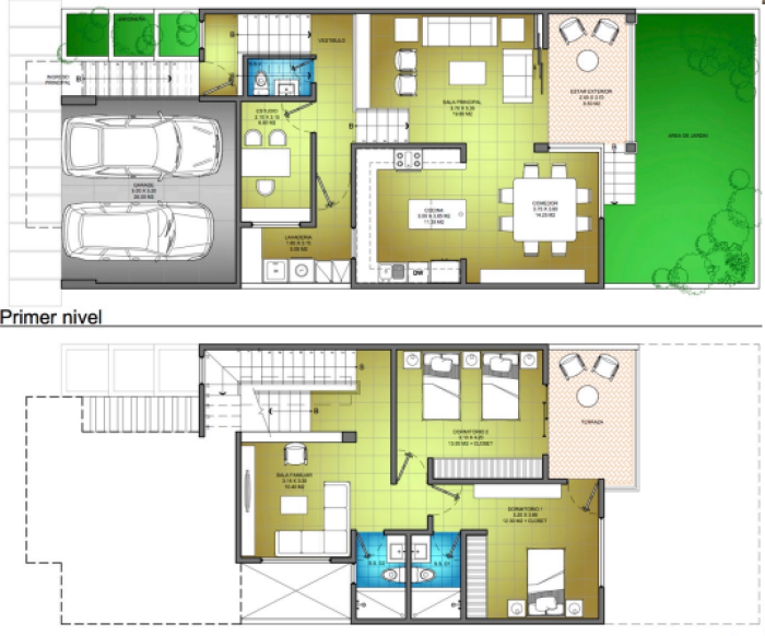 Primer Nivel: sala, comedor, cocina abierta, lavandería, cuarto de servicio, área de estar exterior, jardín, baño de visita.