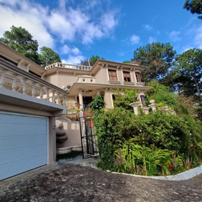 Portón y puerta peatonal eléctricos de acceso a la propiedad, la cual está delimitada con muros perimetrales, calle empedrada de acceso peatonal y vehicular que conducen a la casa de arquitectura con detalles franceses. La puerta principal de vitrales da acceso a un primer nivel, molduras de ventanas, marcos, puertas, gabinetes, closets, construidos con finas maderas (cedro, roble), pisos de mármol verde en primer nivel. Elegantes gradas en semicírculo, forradas de madera, conducen al segundo nivel,con un barandal de hierro forjado. En el segundo nivel se ubica una sala familiar y 4 amplias habitaciones. La habitación master posee un estudio privado, dos walk in closets y baño con jacuzzi, habitación secundaria con walk in closet y baño privado, otras dos habitaciones con closet comparten un baño. El piso del segundo nivel es de chichipate.