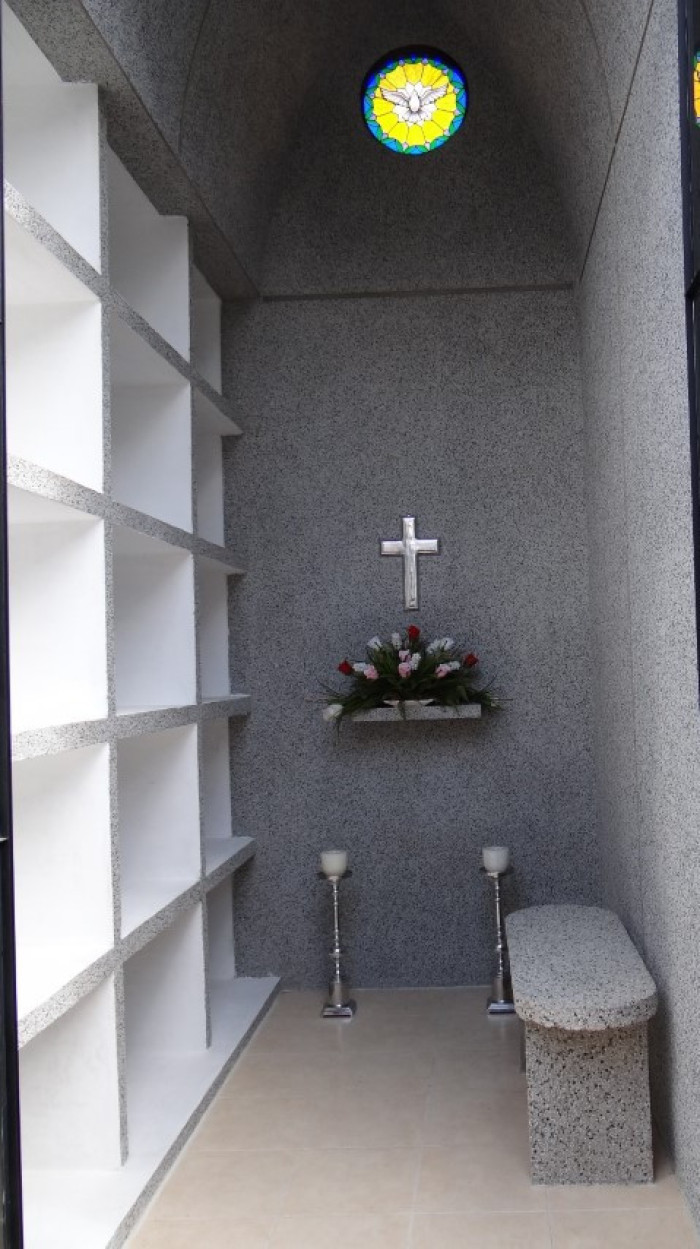 Todo el mausoleo está recubierto de granito, por dentro y por fuera. Cada columbario tiene capacidad para dos osarios, para un total de 30 inhumaciones.