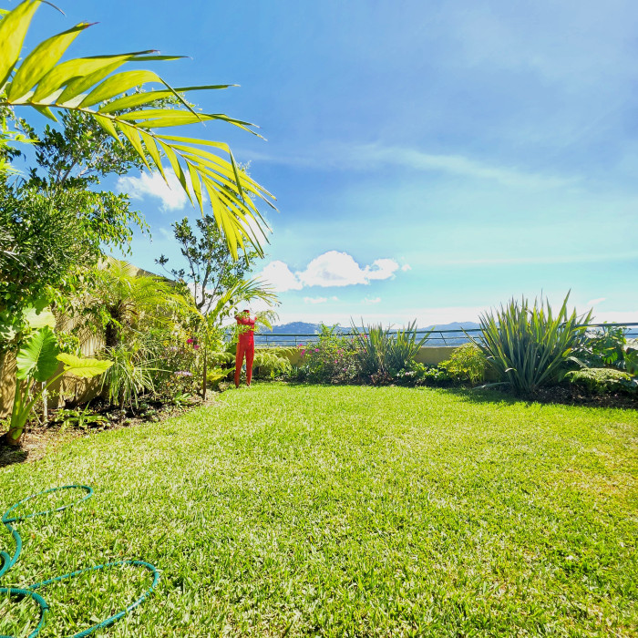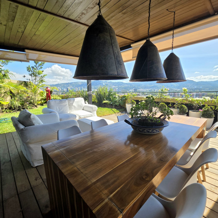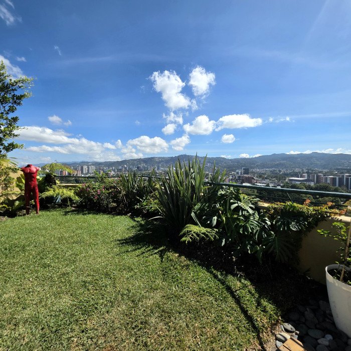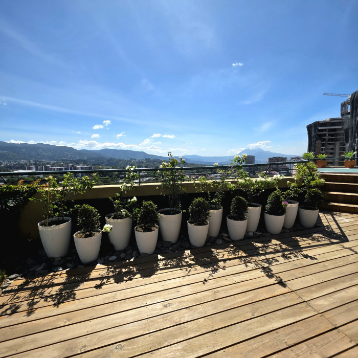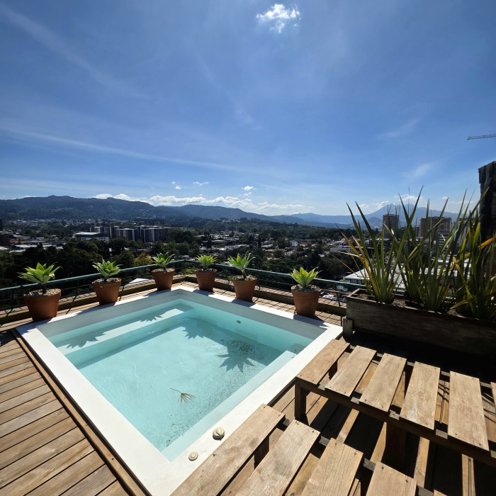 La espectacular terraza con vista panorámica, jardín, pergola y Jacuzzi hacen de este espacio un Pent House único en Guatemala
