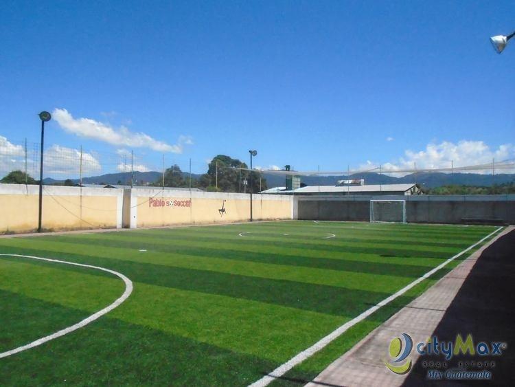 de 22.60 metros de frente por 129 metros de fondo, ubicado en San Miguel Petapa, instalaciones de canchas deportivas de fútbol sala, la propiedad cuenta con área de estacionamiento para vistas, servicios de agua y energía eléctrica, servicios sanitarios, construcción reciente, ideal para inversionista u otros proyectos.